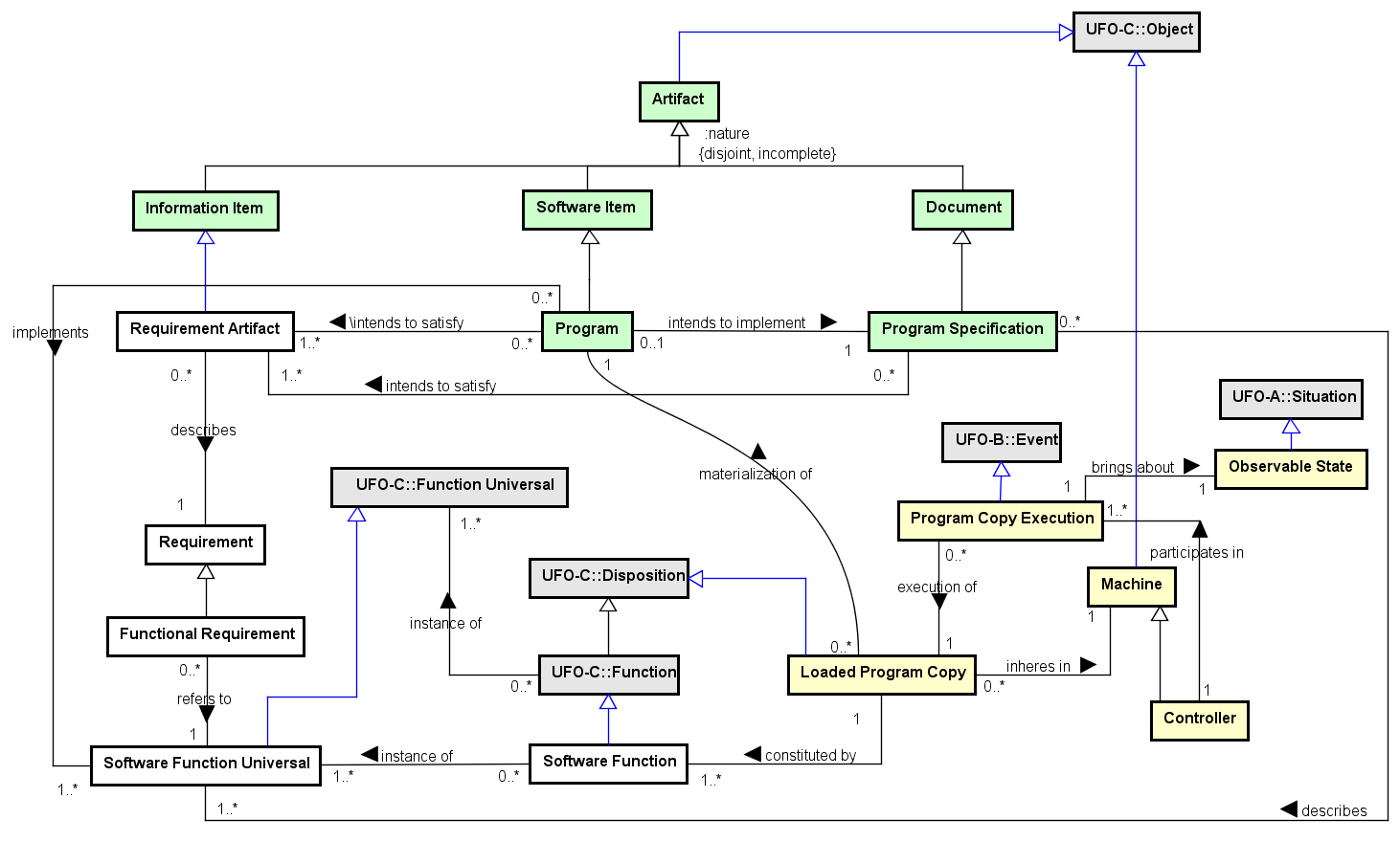 A Program is defined as a Software Item, a piece of software, produced during the software process, not considered a complete Software Product, but which aims at producing a certain result through execution on a computer, in a particular way, given by the Program Specification. In other words, a Program intends to implement a Program Specification, that intends to satisfy a set of Requirement Artifacts. Thus, we can say that there is a relation between Program and Requirement Artifact that is derived from the existing relation between Program Specification and Requirement Artifact.