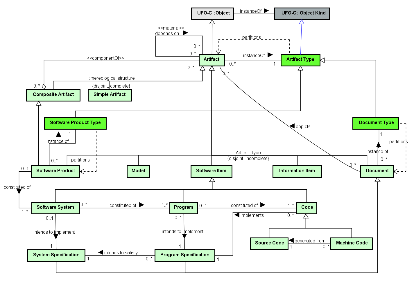 SwAO captures that software products have a complex artifactual nature, being constituted of software artifacts of different nature, including software systems, programs and code. Artifacts are objects consumed or produced during the software process. They can present different nature and composition. Possible types of Artifacts are (not limited to): Software Product (e.g. Eclipse IDE), Software Item (e.g. a database schema), Information Item (e.g. a bug reported), Model (e.g. a UML class model) and Document (e.g. a requirements specification). Documents can depict other Artifacts, as it is the case of a Design Specification describing a Software Architecture. The concepts Artifact Type, Document Type and Software Product Type define the possible specializations of Artifact, Software Product and Document (respectively).